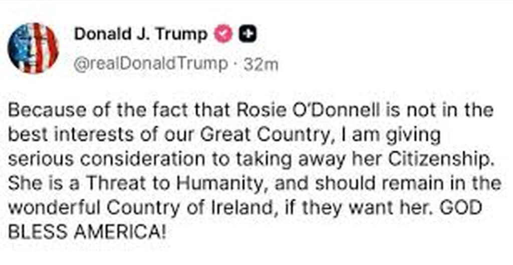 In the post, he wrote: “Because of the fact that Rosie O’Donnell is not in the best interests of our Great Country, I am giving serious consideration to taking away her Citizenship. She is a Threat to Humanity, and should remain in the wonderful Country of Ireland, if they want her. GOD BLESS AMERICA!”